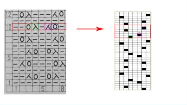 Knitting work 機械の模様編より特殊模様 手持ちの編み本、【機械の模様編み】に載っている模様ですが展開図が載っていないので編み方を考えていました。左上2目一度とか右上2目一度とかけ目の位置がレースキャリジの進行方向と違うので少し複雑です。選針だけして目移しを手作業にすれば簡単なので... 2014.11.09 Knitting work